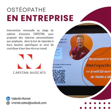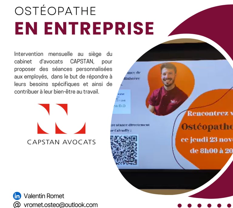 Intervention mensuelle au siège du cabinet d'avocats CAPSTAN, pour proposer des séances personnalisées aux employés, dans le but de répondre à leurs besoins spécifiques et ainsi de contribuer à leur bien-être au travail.
