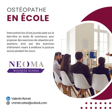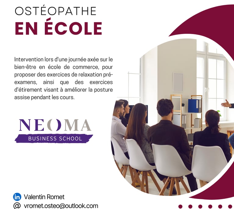 Intervention lors de journées axées sur le bien-être en école de commerce, pour proposer des exercices de relaxation pré-examens, ainsi que des exercices d'étirement visant à améliorer la posture assise pendant les cours.