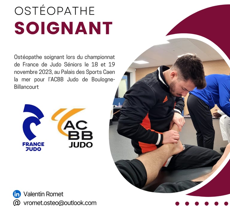 Ostéopathe soignant lors du championnat de France de Judo Séniors le 18 et 19 novembre 2023, au Palais des Sports Caen la mer pour l’ACBB Judo de Boulogne-Billancourt