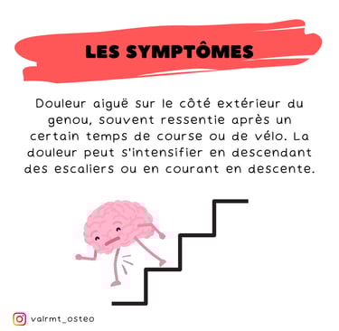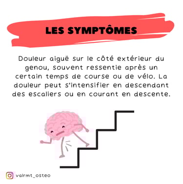Symptômes 🛌 : Douleur aiguë sur le côté extérieur du genou, souvent ressentie après un certain temps de course ou de vélo. La douleur peut s’intensifier en descendant des escaliers ou en courant en descente.