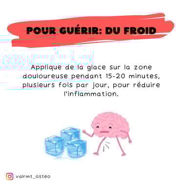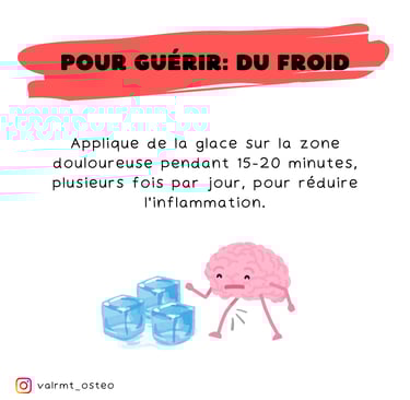 Glace ❄️ : Applique de la glace sur la zone douloureuse pendant 15-20 minutes, plusieurs fois par jour, pour réduire l’inflammation.