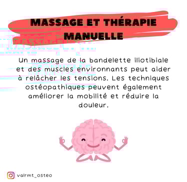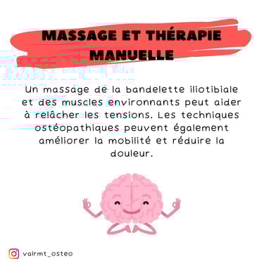 Massage et Thérapie Manuelle 👐 : Un massage de la bandelette iliotibiale et des muscles environnants peut aider à relâcher les tensions. Les techniques ostéopathiques peuvent également améliorer la mobilité et réduire la douleur.