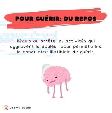 Repos 🛌 : Réduis ou arrête les activités qui aggravent la douleur pour permettre à la bandelette iliotibiale de guérir.