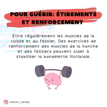 Étirements et Renforcement 🧘♂️ : Étire régulièrement les muscles de la cuisse et du fessier. Des exercices de renforcement des muscles de la hanche et des fessiers peuvent aider à stabiliser la bandelette iliotibiale.