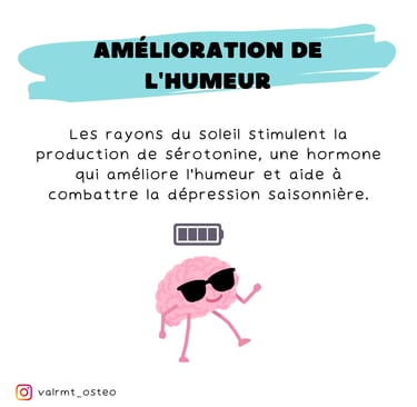 Amélioration de l’Humeur 😊 : Les rayons du soleil stimulent la production de sérotonine, une hormone qui améliore l’humeur et aide à combattre la dépression saisonnière.